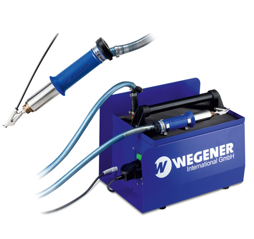 Wegener blows AB 60 with hot air welder Autotherm 3, digital, 1000W 230V, with 8 m. Hose connection. 1 piece. reserve heater. 1 piece. staple nozzle. 1 piece. round nozzle. 1 piece. Ø4 mm. high-speed welding nozzle. Round brush for cleaning nozzles.