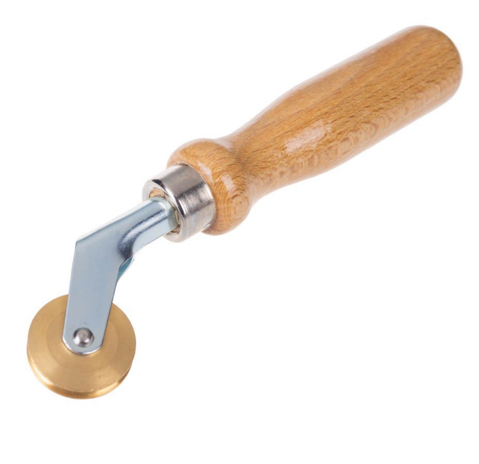 Pressure roller in brass with a shape of Ø 5 mm. soft welding wire. - Ball bearing - 118 mm wooden handle - Pressure roller for linoleum and pvc welding wire