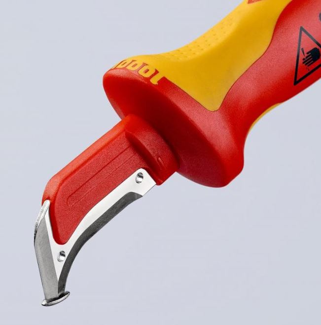 Cable sheath knife Hook Red, supplied with safety sheath. For cutting protective sheaths on PE pipes and un-insulating cables. Insulated up to 1000 V according to DIN EN 60900 / VDE 0682-201.