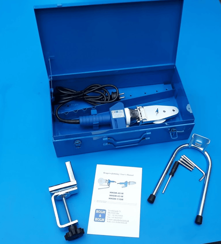 Type HHSW-40-W . electronic digital controlled socket heating tools with interval control lamp, to spigots and sockets from OD 16 up to OD 40 mm. 230V 650W. Working temperature 201 – 279°C. Net Weight 1 kg. Included : bolts and key. Stand. Steel case with space for spigots and sockets. Without spigots and sockets.