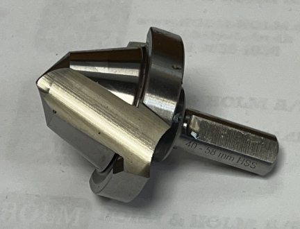 Plate drill / cone drill with drill tip and cone (22,5°) from Ø17 to Ø30 mm. Depth stop Ø40 mm. Shaft Ø10 mm.