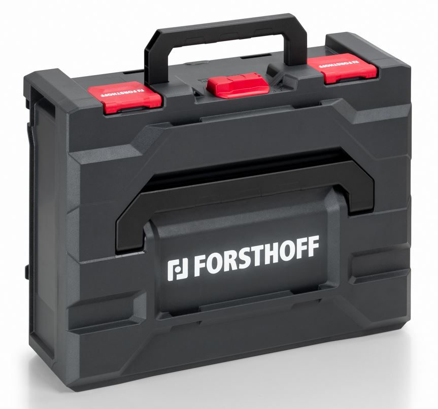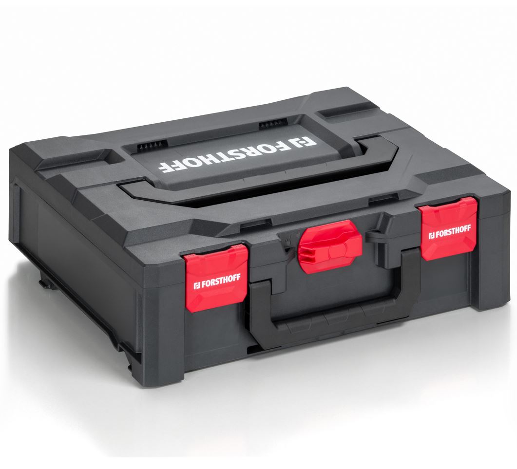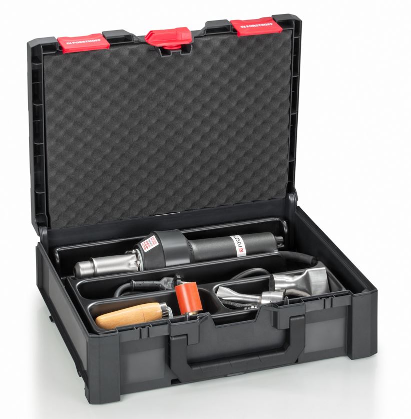 Transport case Forsthoff Meta Box with lifting handle both in front and top External dimensions 450x350x150 mm. Removable molded insert, with compartments for hot air welders, nozzles and tools