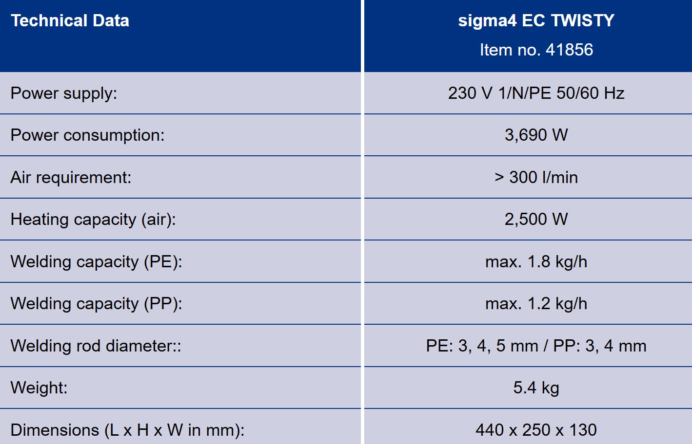 Features: 4th generation WEGENER microprocessor control for air and extrudate temperature and for motor control incl. recipe management for selected materials Multifunctional color display for actual and set temperature of preheating air and extrudate as well as performance control of main drive Extended cold start protection (temperature and time-dependent start-up protection of the device) Monitoring of the pre-set target temperature of the extrudate heater with motor-stop function if the deviation is too high External air supply through a WEGENER air heater 2,500 W Easily exchangeable PTFE welding shoe, adjustable front handle Modular and adaptable LED lighting for optimized illumination of the welding area with reduced shadowing Modular and easy to maintain design The scope of delivery includes a welding shoe of your choice and an integrated or external unit stand