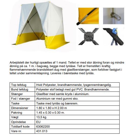 Work tent / mounting tent, as above, with the dimensions 180 x 180 x H 200 cm. Weight approx. 14 kg. 1 m. Opening at the back. Comes with shoulder bag