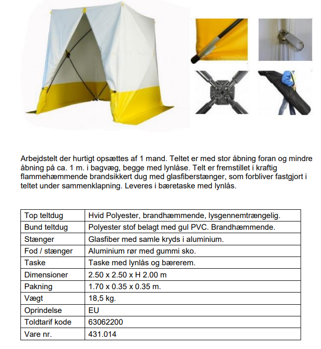 Work tent / mounting tent, as above, with the dimensions 250 x 250 x H 200 cm. Weight approx. 18 kg. 1 m. Opening at the back. Comes with shoulder bag