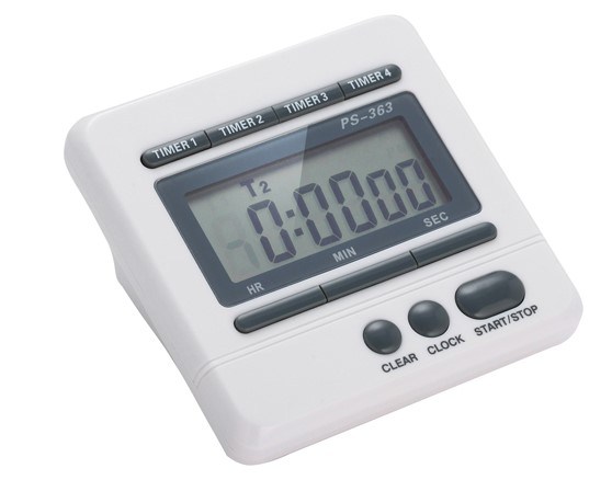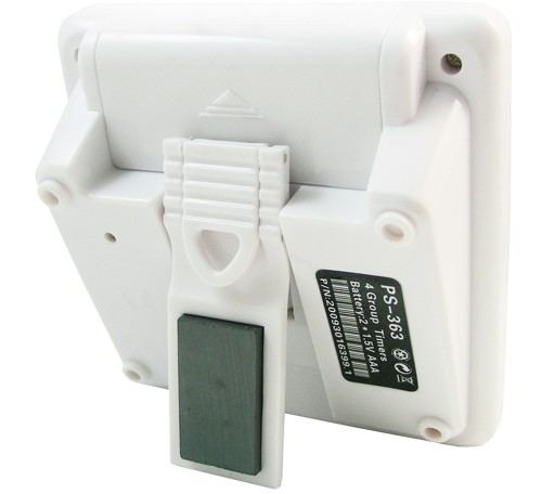 4-channel timer with support foot and clips and magnet. 85 x 85 mm. Including 2 pcs. AAA batteries.
